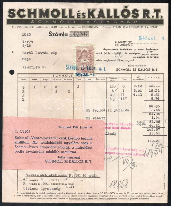 1942 Schmoll és Kallós R.T. fejléces számla, Schmoll-Pasta hányad hátr... https://www.darabanth.com/de/457-Fernauktion/457.0/Kunst-Dokumente-andere-Sammelgebiete/Werbungen~2000359/1942-Schmoll-es-Kallos-RT-fejleces-szamla-Schmoll-Pasta-hanyad-hatralekos-megkuldesero~II3053260