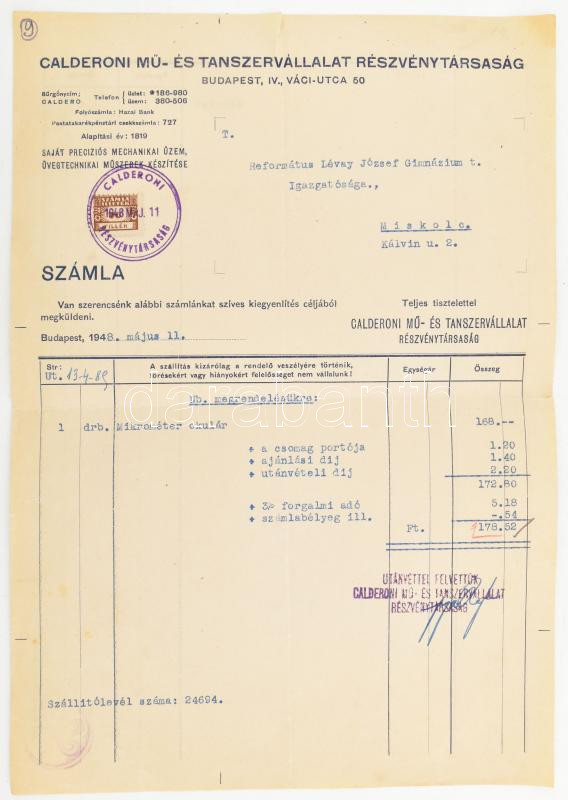 Beschreibung: 1948 Calderoni mű- és transzfervállalat Részvénytársaság fejléces számla