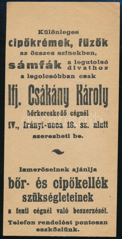 Csákány Károly cipőkrém, fűzők számolócédula https://www.darabanth.com/de/457-Fernauktion/457.0/Kunst-Dokumente-andere-Sammelgebiete/Werbungen~2000359/Csakany-Karoly-cipokrem-fuzok-szamolocedula~II3030942