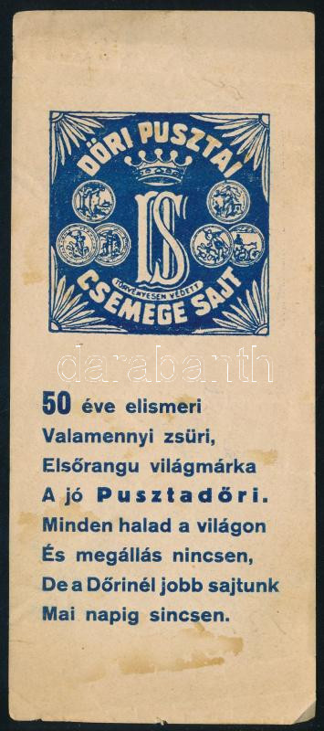 cca 1920 Dőri pusztai sajt, csemegesajt számolócédula https://www.darabanth.com/de/457-Fernauktion/457.0/Kunst-Dokumente-andere-Sammelgebiete/Werbungen~2000359/cca-1920-Dori-pusztai-sajt-csemegesajt-szamolocedula~II3060064