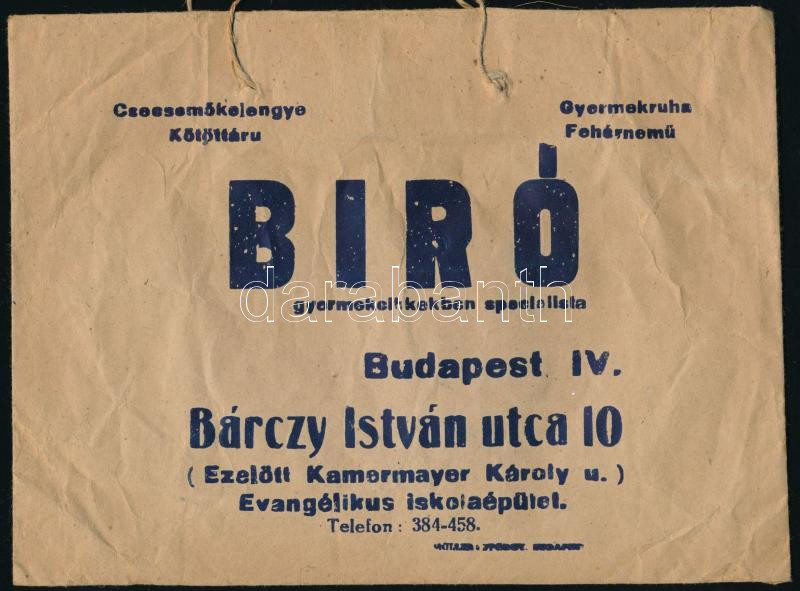 cca 1930-1940 Biró gyermekcikk-specialista (Bp. IV., Bárczy István u. ... https://www.darabanth.com/de/457-Fernauktion/457.0/Kunst-Dokumente-andere-Sammelgebiete/Werbungen~2000359/cca-1930-1940-Biro-gyermekcikk-specialista-Bp-IV-Barczy-Istvan-u-10-reklam-papirzacsko-~II3061752