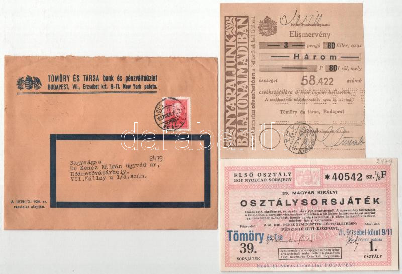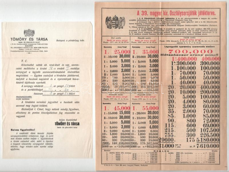 1937. "39. Magyar Királyi Osztálysorsjáték" első osztály egynyolcad sorsjegye bélyegzéssel, vízjeles papíron + hozzá tartozó értesítővel, fizetési elismervénnyel, játéktervvel T:VF kis folt