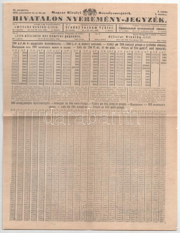 1939. "43. Magyar Királyi Osztálysorsjáték" harmadik osztály... https://www.darabanth.com/de/457-Fernauktion/457.0/Numismatik/Aktien-und-Tickets~6/1939-43-Magyar-Kiralyi-Osztalysorsjatek-harmadik-osztaly-egynyolcad-sorsjegye-belyegzesse~II3061099