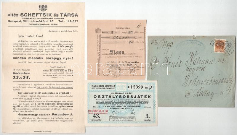 Beschreibung: 1939. "43. Magyar Királyi Osztálysorsjáték" harmadik osztály egynyolcad sorsjegye bélyegzéssel, vÃzjeles papÃron + hozzá tartozó értesÃtÅ‘vel, fizetési elismervénnyel, nyeremény-jegyzékkel T:AU kis ceruzás firka