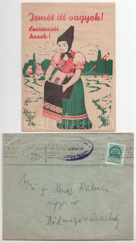 ~1939. "Ismét itt vagyok! Szerencsét hozok!" Vitéz Scheftsik... https://www.darabanth.com/de/457-Fernauktion/457.0/Numismatik/Aktien-und-Tickets~6/7E1939-Ismet-itt-vagyok-Szerencset-hozok-Vitez-Scheftsik-es-Tarsa-reklamja-a-43-Magyar-Ki~II3061183