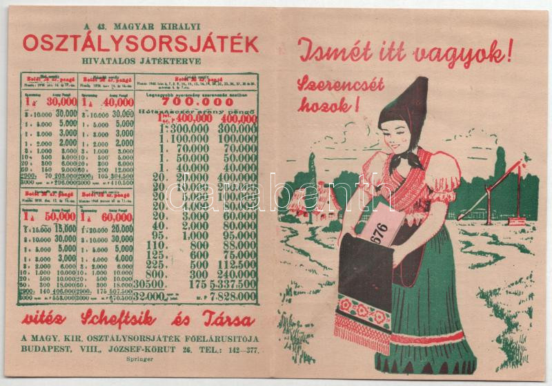 Beschreibung: ~1939. "Ismét itt vagyok! Szerencsét hozok!" Vitéz Scheftsik és Társa reklámja a 43. Magyar Királyi Osztálysorsjátékhoz, 3 db szerencseszámmal.