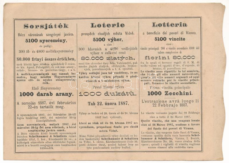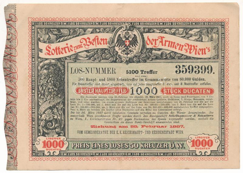 Ausztria 1887. "Sorsjegy a bécsi szegények megsegítésére" so...