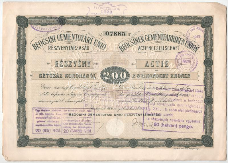 Budapest 1906. "Beocsini Cementgyári Unió Részvénytársaság" részvénye 200K-ról, magyar és német nyelven, szelvényekkel, bélyegzésekkel, perforált "CEMENTIA HOLDING RÉSZVÉNYT KIADTUK" felirattal, vízjeles "ZÁGRÁBI PAPÍRGYÁR" papíron T:F