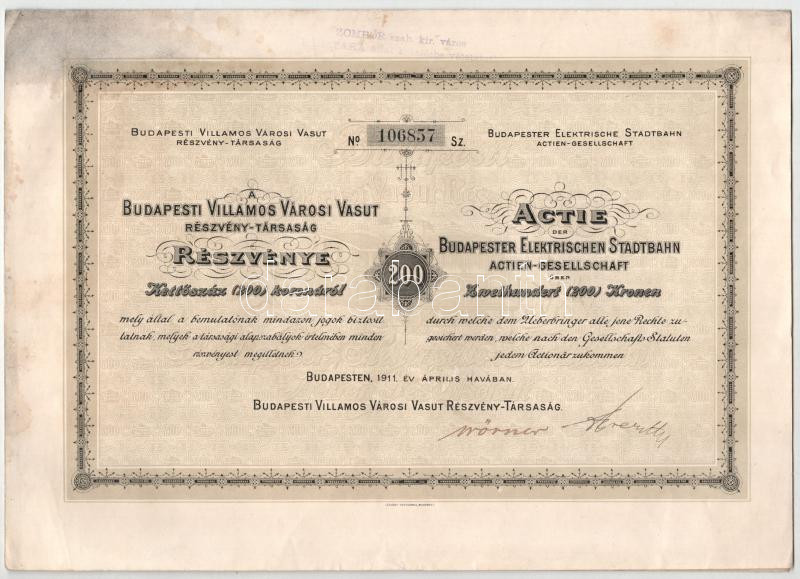Budapest 1911. "Budapesti Villamos Városi Vasut Részvény-Társaság" részvénye 200K-ról, szelvényekkel magyar és német nyelven, felülbélyegzéssel T:F ázásnyom, kis lyuk / Hungary / Budapest 1911. "Budapesti Villamos Városi Vasut Részvény-Társaság" share about 200 Korona with coupons in Hungarian and German language C:XF soaked