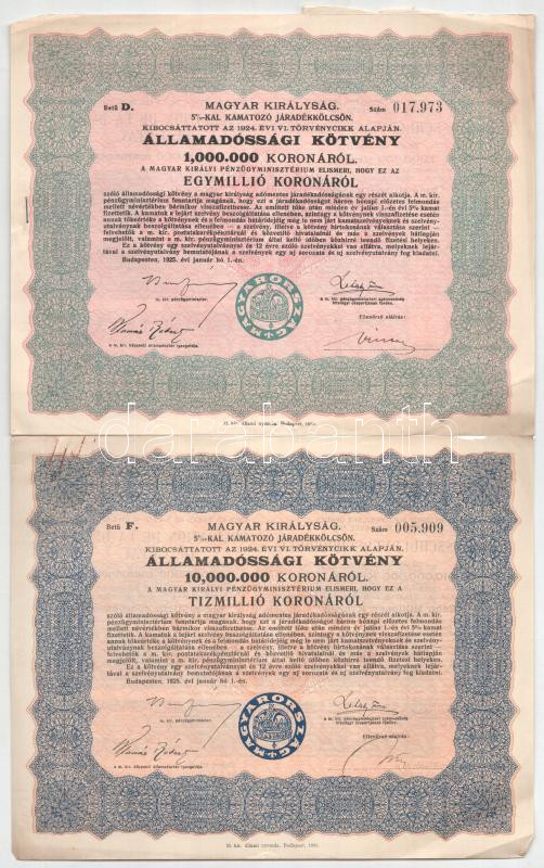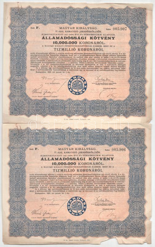 Beschreibung: Budapest 1925. "Magyar Királyság 5%-kal kamatozó Járadékkölcsön Államadóssági Kötvény" 125.000K-ról + 500.000K-ról + 1.000.000K-ról (3x) + 10.000.000K (3x), több szelvénnyel T:F beszakadás