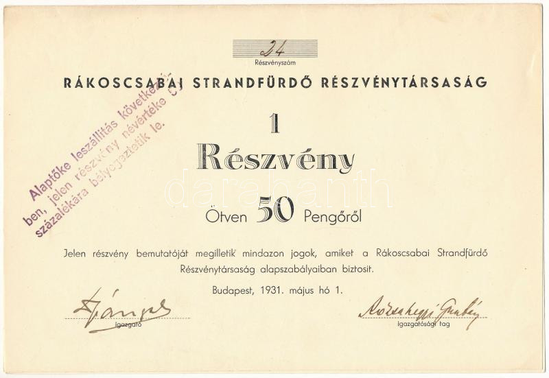 Budapest 1931. "Rákoscsabai Strandfürdő Részvénytársaság" ré... https://www.darabanth.com/de/457-Fernauktion/457.0/Numismatik/Aktien-und-Tickets~6/Budapest-1931-Rakoscsabai-Strandfurdo-Reszvenytarsasag-reszveny-50P-rol-TVF~II2980747