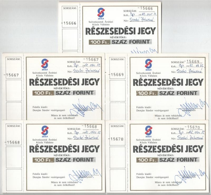 Beschreibung: Budapest 1982. "Skála - Szövetkezetek Áruházi Közös Vállalata" névre szóló részesedési jegye 100Ft-ról (5x) sorszámkövetők T:AU