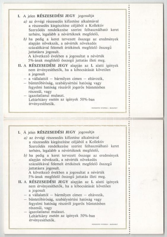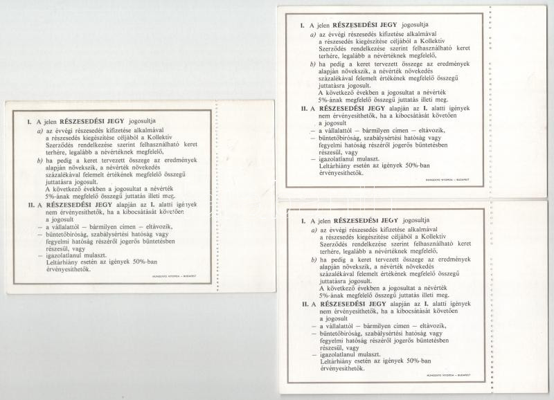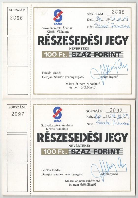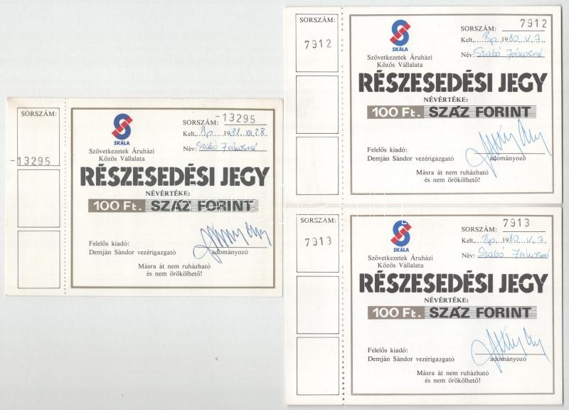Beschreibung: Budapest 1982. "Skála - Szövetkezetek Áruházi Közös Vállalata" névre szóló részesedési jegye 100Ft-ról (5x), közte sorszámkövetők T:AU