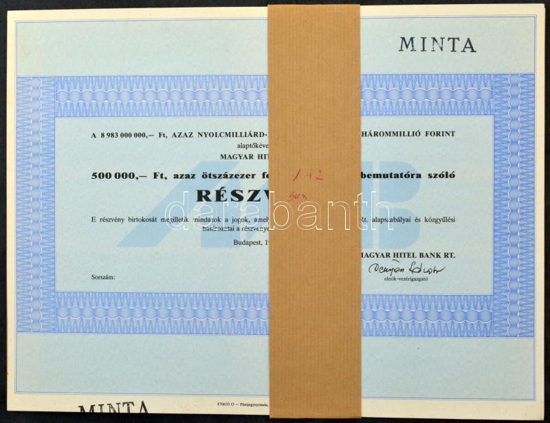 Beschreibung: Budapest 1987. "Magyar Hitel Bank Rt." bemutatásra szóló részvénye 500.000Ft névértékben, "MINTA" felülbélyegzéssel, szelvényekkel T:AU