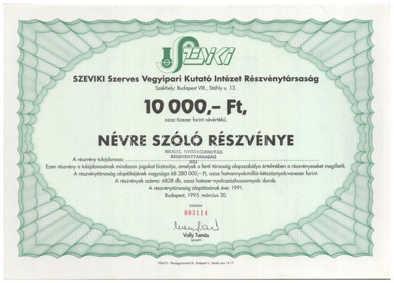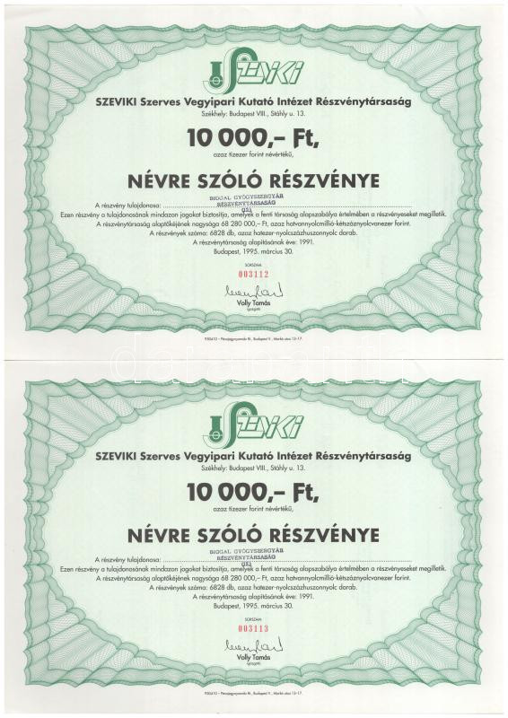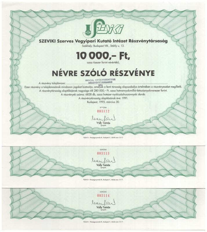 Budapest 1995. "SZEVIKI Szerves Vegyipari Kutató Intézet Részvénytársaság" névre szóló részvénye 10.000Ft-ról (3x) sorszámkövetők, szelvényekkel, bélyegzéssel T:AU