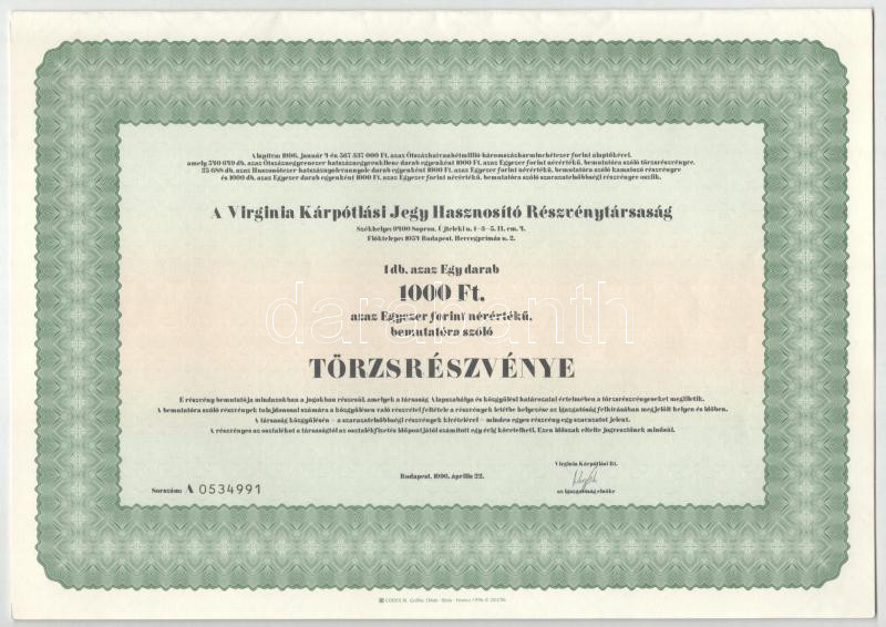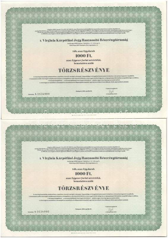 Budapest 1996. "A Virginia Kárpótlási Jegy Hasznosító Részvénytársaság' törzsrészvénye 1000Ft-ról szelvényekkel (3x) sorszámkövetők "A 0534989 - A 0534991" T:UNC,AU