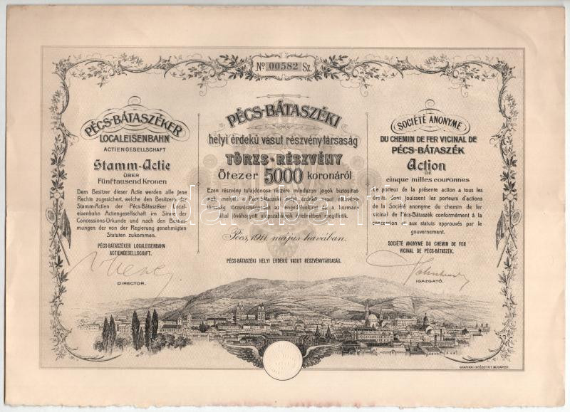 Pécs 1911. "Pécs-Bátaszéki Helyi Érdekű Vasút Részvénytársaság&qu... https://www.darabanth.com/de/457-Fernauktion/457.0/Numismatik/Aktien-und-Tickets~6/Pecs-1911-Pecs-Bataszeki-Helyi-Erdeku-Vasut-Reszvenytarsasag-torzs-reszvenye-5000K-~II3056766