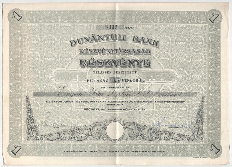 Pécs 1941. "Dunántúli Bank Részvénytársaság" névre szóló rés... https://www.darabanth.com/de/457-Fernauktion/457.0/Numismatik/Aktien-und-Tickets~6/Pecs-1941-Dunantuli-Bank-Reszvenytarsasag-nevre-szolo-reszvenye-100P-rol-szelvenyek~II2981382