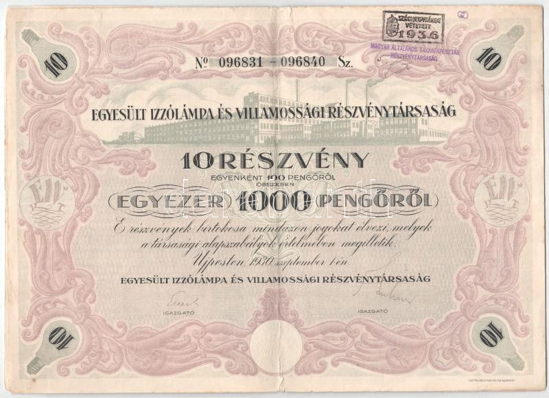 Újpest 1930. "Egyesült Izzólámpa és Villamossági Részvénytársaság" 10 részvénye egyben, összesen 1000P-ről, szárazpecséttel, szelvényekkel T:F nagyobb szakadás / Hungary / Újpest 1930. "United Incandescent Lamp and Electricity Share Company" 10 share in one, all about 1000 Pengp, with embossed stamp and coupons C:F big tear