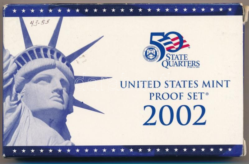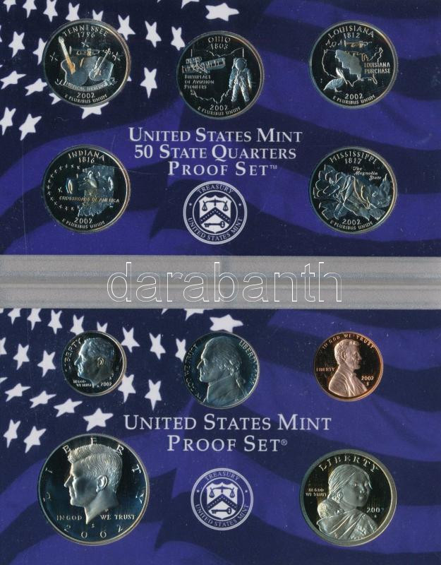 USA 2002S 1 Cent - 1 Dollar (5xdiff) coin set in plastic case + 1/4 Dollar Cu-Ni "50 States" (5xdiff) in plastic case, with common certificate in cardboard case C:PP spotted