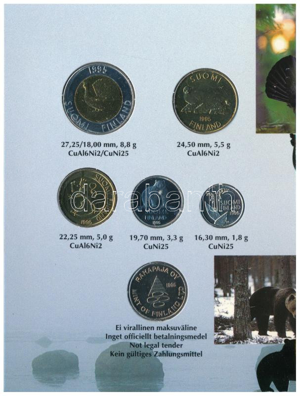 Beschreibung: Finnország 1995. 10p - 10M (5xklf) forgalmi sor + "Finn verde / Conrad Lihr" zseton szettben, karton dísztokban T:UNC