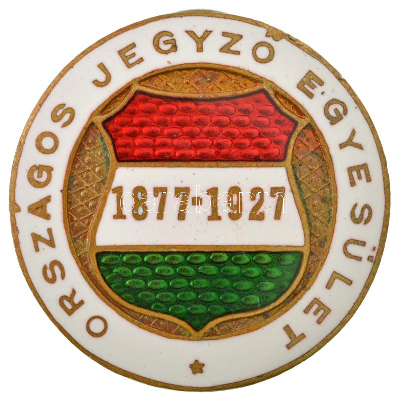 1927. "Országos Jegyző Egyesület 1877-1927" zománcozott gomb... https://www.darabanth.com/de/457-Fernauktion/457.0/Numismatik/Faleristik-Auszeichnungen-Medaillen-Orden~21/1927-Orszagos-Jegyzo-Egyesulet-1877-1927-zomancozott-gomblyukjelveny-MORZSANYI-gyartoi~II2999908