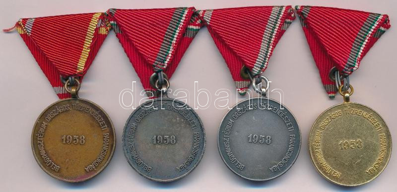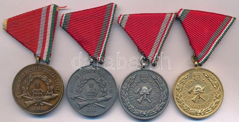 1958. "V Éves Önkéntes Tűzoltói Szolgálatért" bronz kitüntetés mellszalagon + "X Éves Önkéntes Tűzoltói Szolgálatért" ezüstpatinázott bronz kitüntetés mellszalagon + "XV Éves Önkéntes Tűzoltói Szolgálatért" ezüstpatinázott kitüntetés mellszalaggal (a fül letört az éremről) + "XX Éves Önkéntes Tűzoltói Szolgálatért" aranyozott bronz kitüntetés mellszalagon T:AU,XF