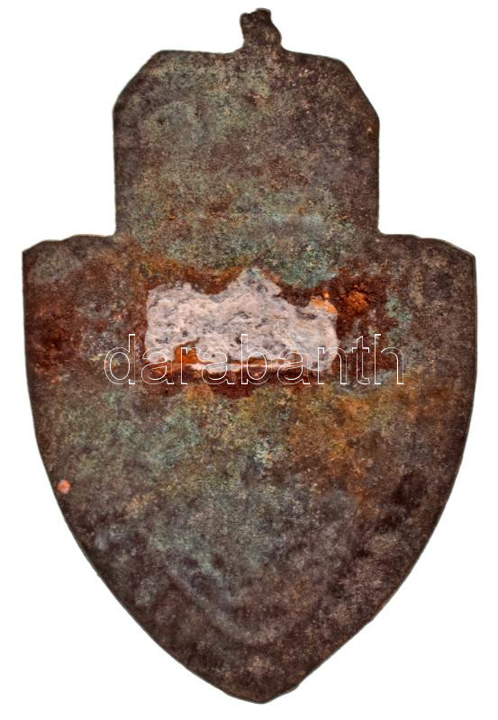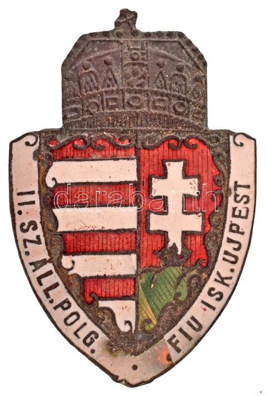~1930-1940. "II. sz. Áll. Polg. Fiu Isk. Ujpest (II. számú Állami Polgári Fiú Iskola Újpest)" zománcozott sapkajelvény, rögzítőpánt hiányzik (58x38mm) T:VF zománchiba