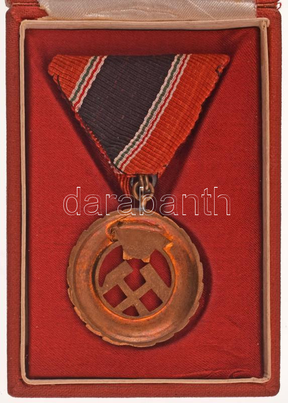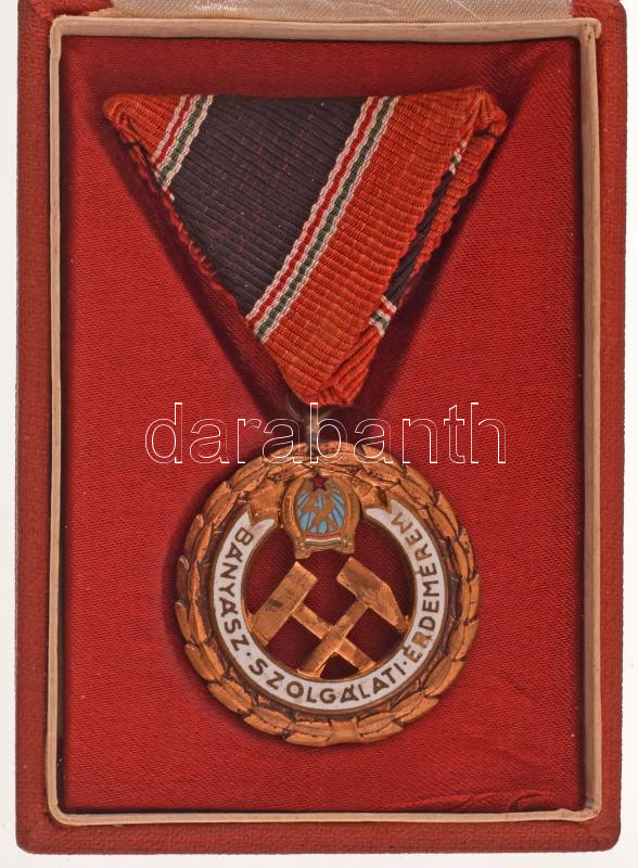 ~1950. "Bányász Szolgálati Érdemérem bronz fokozata" zománcozott bronz kitüntetés mellszalagon Rákosi-címeres rátéttel (a rátét is zománcos kivitelű), nem hozzá tartozó Rákosi-címeres dombornyomott tokban T:AU NMK.: 669.