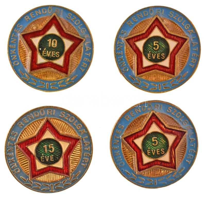 ~1970. "Önkéntes rendőri szolgálatért" műgyantás fém kitüntető jelvény (4db, 3xklf: 5 éves, 10 éves és 15 éves szolgálatért) T:UNC,AU