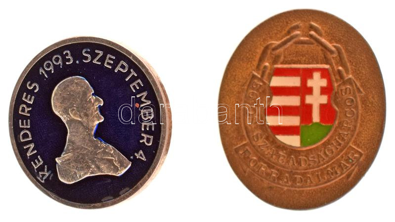 DN "56-os szabadságharcos forradalmár" részben műgyantás bronz jelvény (25x20mm) + 1993. "Kenderes 1993. szeptember 4." Horthy Miklóst ábrázoló műgyantás fém jelvény a kormányzó újratemetésének emlékére (20mm) T:AU
