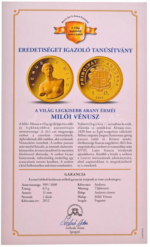 Andorra 2012. 1 Dinar Au "Venus of Milo" with "The smallest gold coins in the world" certificate (0,5g/0.999) C:PP