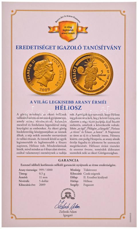 Cook Islands 2009. 5 Dollars Au "Helios God of the Sun" with "The smallest gold coins in the world" certificate (0,5g/0.999) C:PP