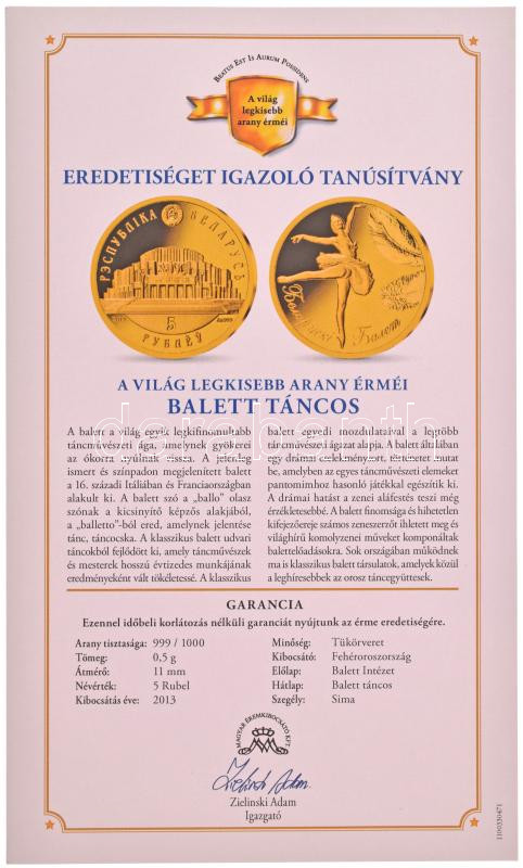 Oroszország 2013. 5R Au "Balett táncos", "A világ legkisebb arany érméi" tanúsítvánnyal (0,5g/0.999) T:PP