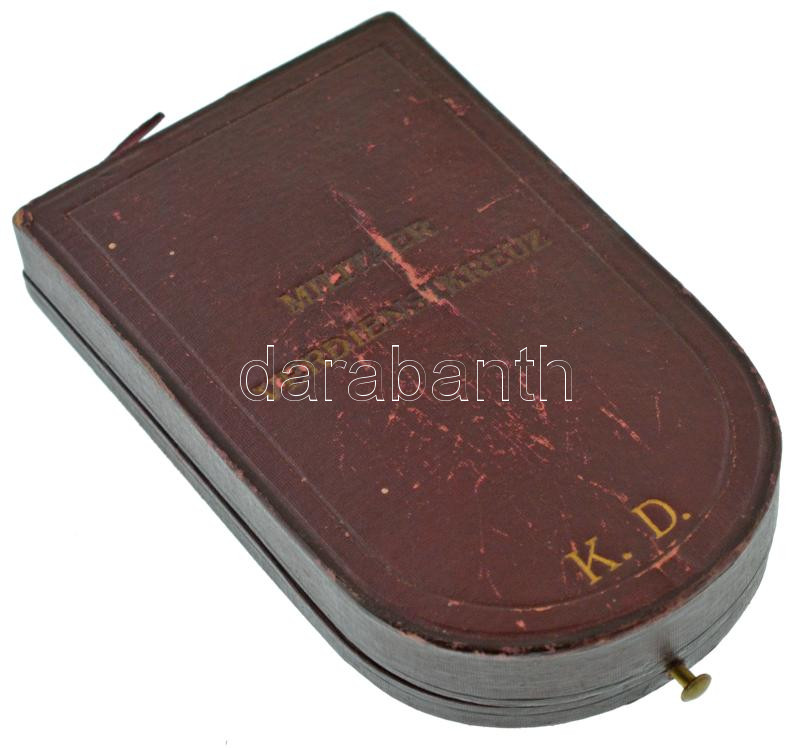 1916. "A Katonai Érdemkereszt III. Osztálya hadidíszítménnyel és kardokkal" fülön jelzett, zománcozott Ag kitüntetés mellszalagon, eredeti tokban T:XF zománchiba Hungary 1916. "Military Merit Cross, 3rd Class with war decoration" enamelled Ag decoration on ribbon, hallmarked on the ear, in original case C:XF enamel error NMK 175.