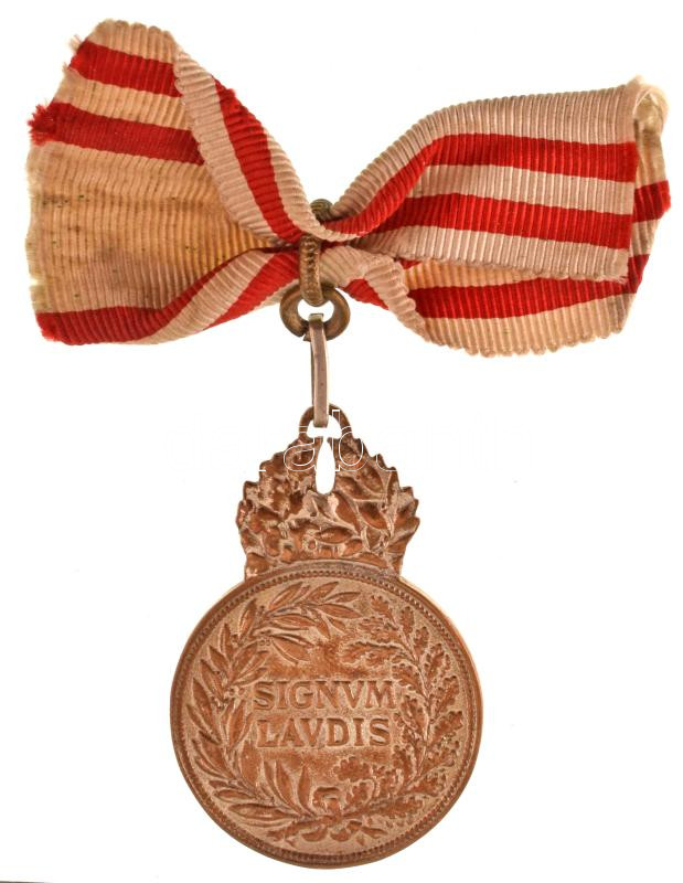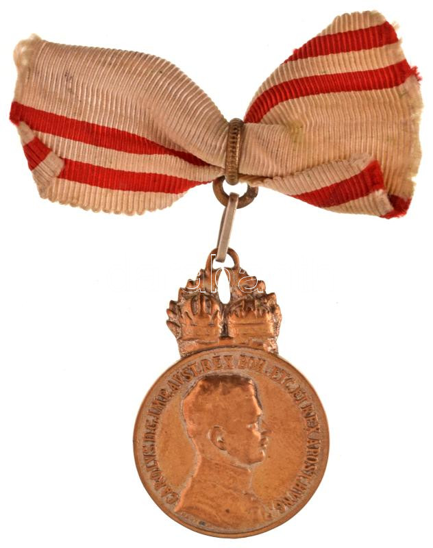 1917. "Károly Ezüst Katonai Érdemérem a katonai érdemkereszt szalagján" ezüstözött bronz kitüntetés női csokorszalagon, pótolt kontraszemmel T:VF ezüstözés lekopott Hungary 1917. "Silver Militarty Order of Merit on wartime ribbon" silver plated bronze decoration on women's ribbon, suspension ring is changed C:VF worn silver plating NMK.: 323