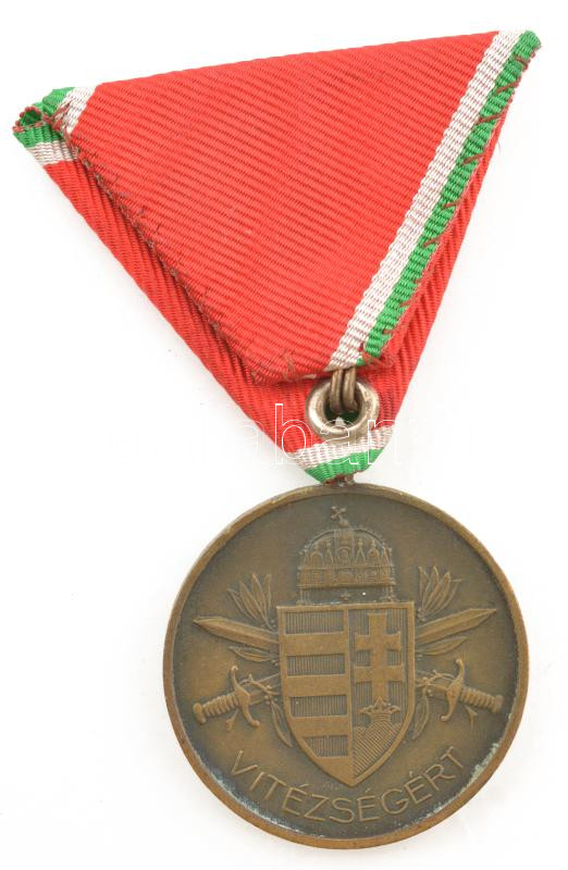 1939. "Magyar Bronz Vitézségi Érem" bronz kitüntetés, fémjel nélkül, modern mellszalaggal T:AU,XF / Hungary 1939. "Bronze Medal for Bravery" bronze decoration with modern ribbon C:AU,XF NMK 439.