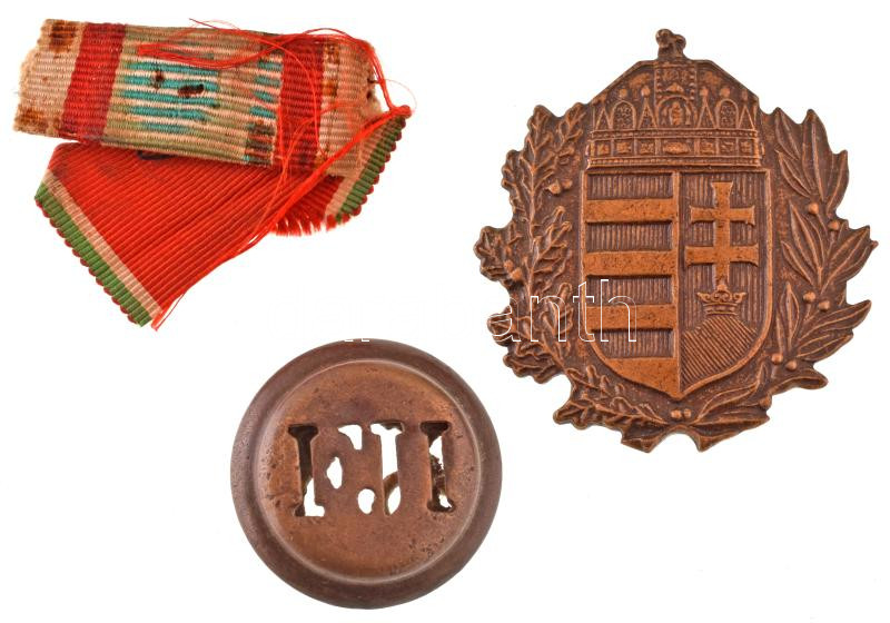 4db-os, nagyrészt militária témájú tétel, közte ~1914-1918. "FJI (Ferenc József Gyalogság)" fém sapkarózsa (30mm) + DN magyar címert ábrázoló bronz jelvény (48x45mm) + hadiszalag szalagsávja + háborús emlékérem szalagsávja T:XF-F sérült, foltos szalag, a sapkarózsa egyik rögzítőpántja letört