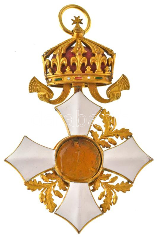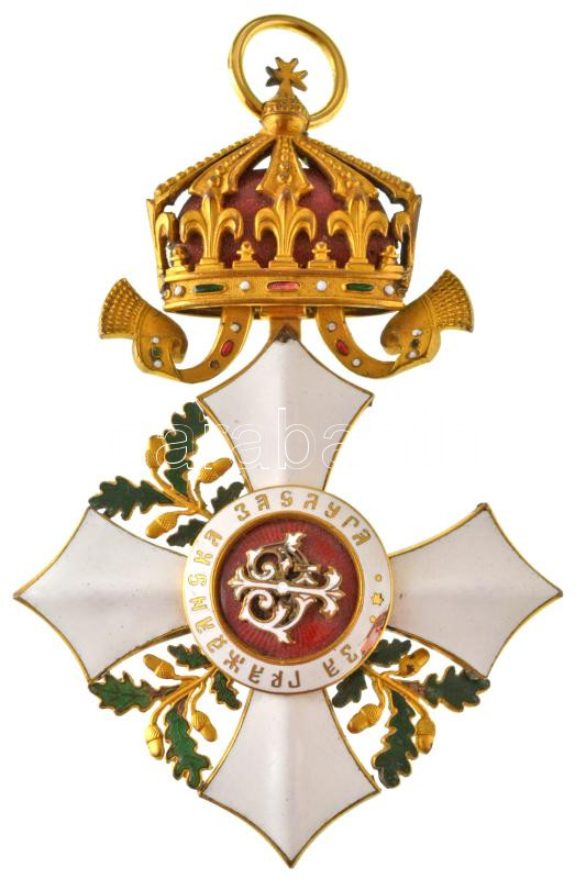 Bulgária 1908. "Polgári Érdemrend Parancsnoki Kereszt" zománcozott, aranyozott fém kitüntetés mellszalag nélkül, erősen sérült, hiányos, részben javított állapotban (63x95mm) T:F Bulgaria 1908. "Order of Civil Merit Commander's Cross" enamelled, gilt metal decoration without ribbon, in badly damaged, incomplete, partially repaired condition (63x95mm) C:F