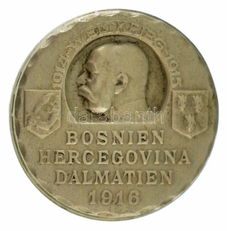 Osztrák-Magyar Monarchia 1916. "Bosznia-Hercegovina Dalmácia - Világháború 1914-1915" fém lemezjelvény, hátoldalon "ATELIER G. GÜRSCHNER WIEN VII/2 LINDENGASSE 9" gyártói jelzéssel (32mm) T:XF Austro-Hungarian Monarchy 1916. "Bosnien Hercegovina Dalmatien - Weltkrieg 1914-1915" metal badge with "ATELIER G. GÜRSCHNER WIEN VII/2 LINDENGASSE 9" maker's mark on the back (32mm) C:XF