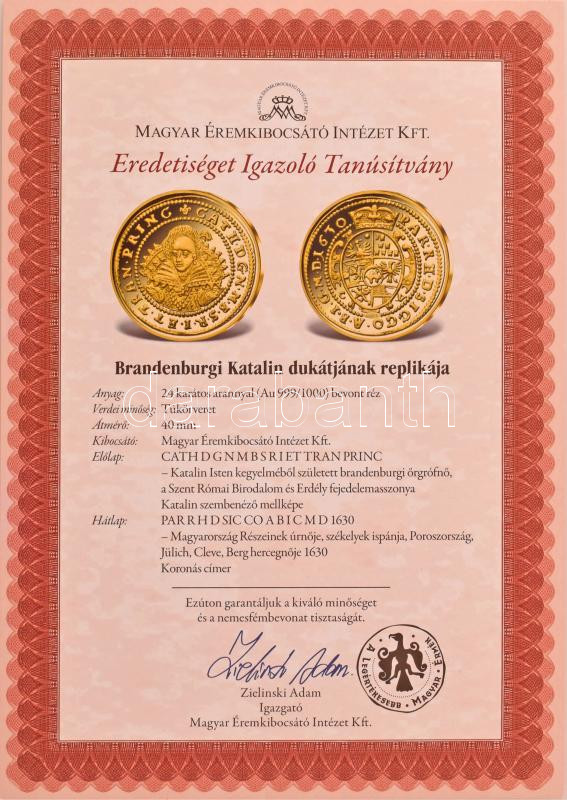 DN "A legértékesebb magyar érmék - Brandenburgi Katalin dukátjának replikája" aranyozott Cu emlékérem, "COPY" jelzéssel, tanúsítvánnyal (40mm) T:PP