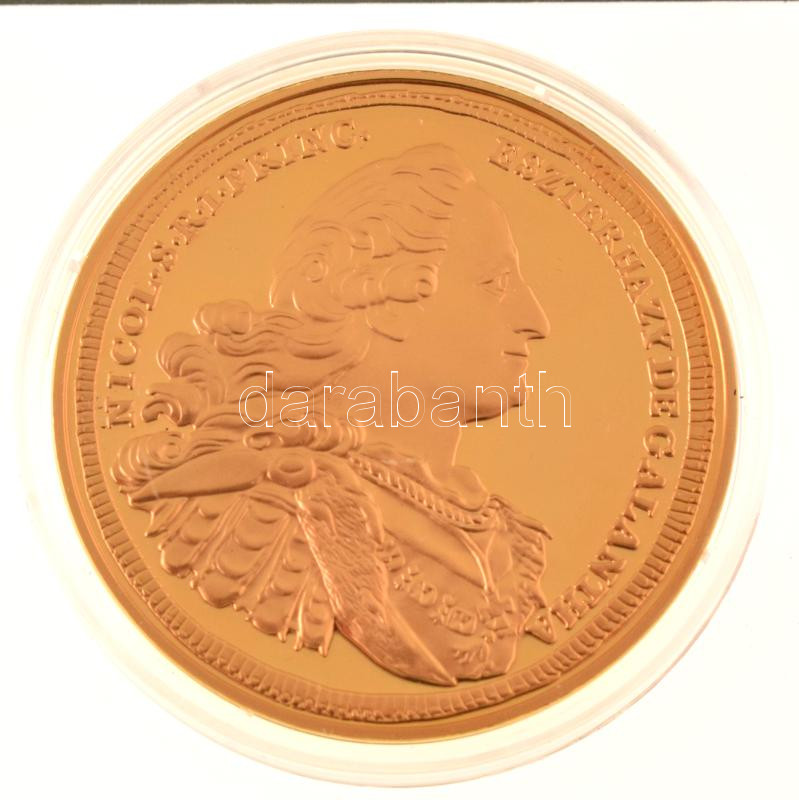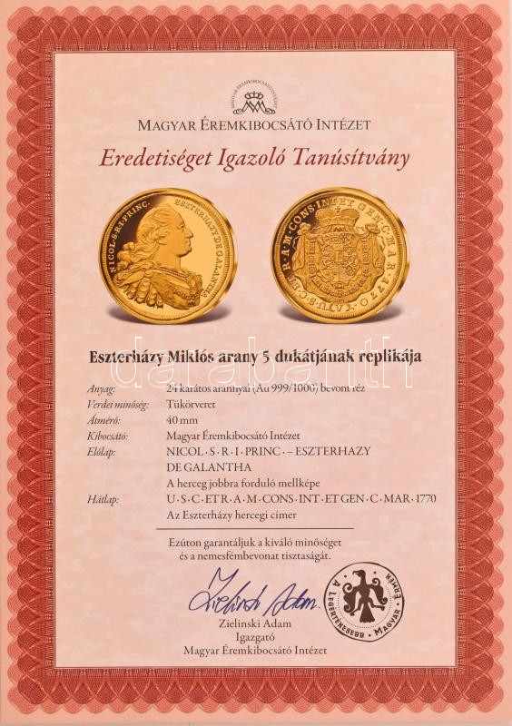 DN "A legértékesebb magyar érmék - Eszterházy Miklós arany 5 dukátjának replikája" aranyozott Cu emlékérem, "COPY" jelzéssel, tanúsítvánnyal (40mm) T:PP