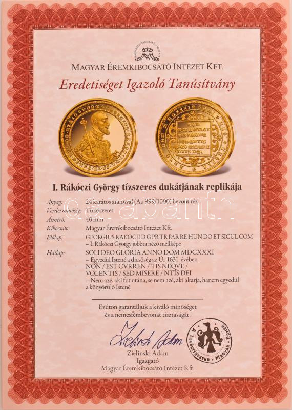 DN "A legértékesebb magyar érmék - I. Rákóczi György tízszeres dukátjának replikája" aranyozott Cu emlékérem, "COPY" jelzéssel, tanúsítvánnyal (40mm) T:PP