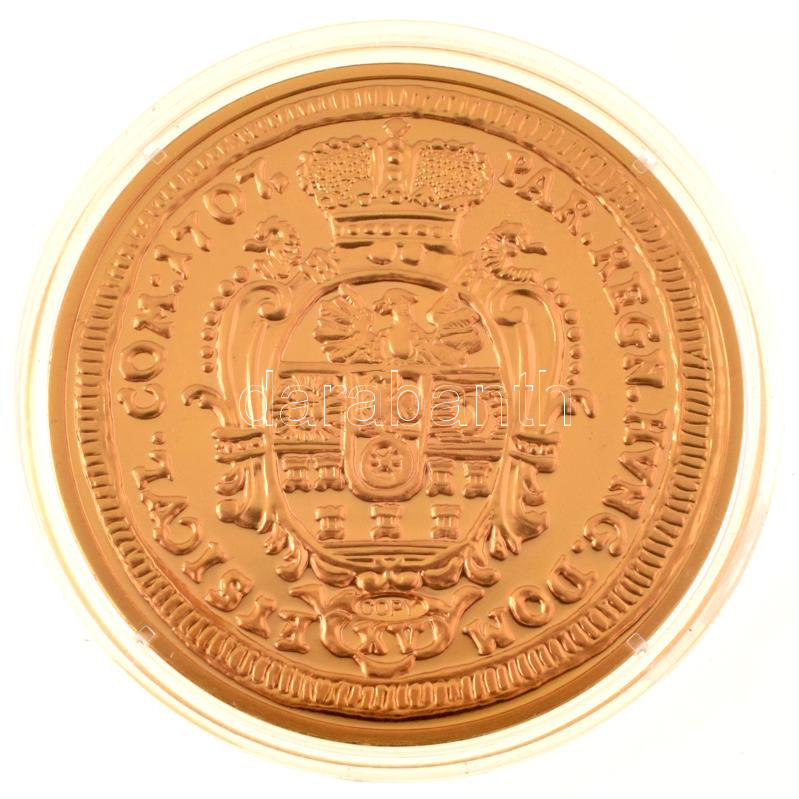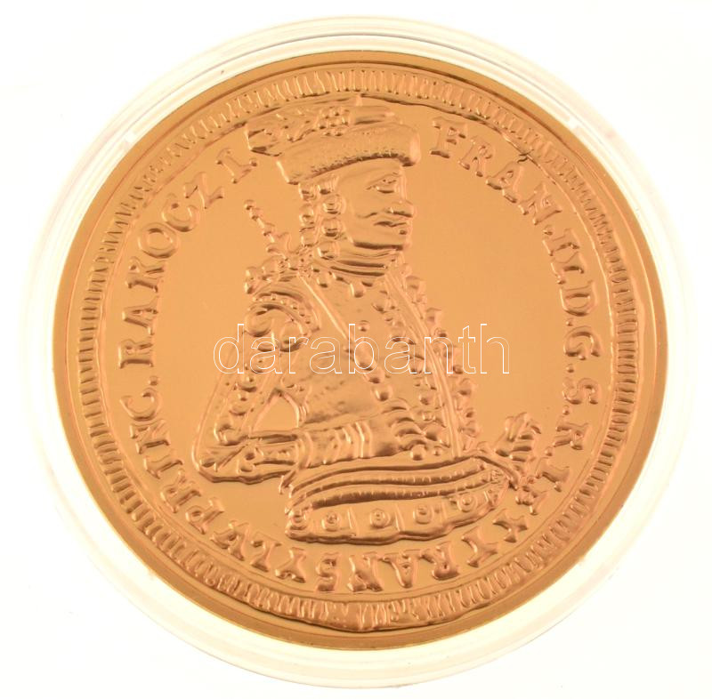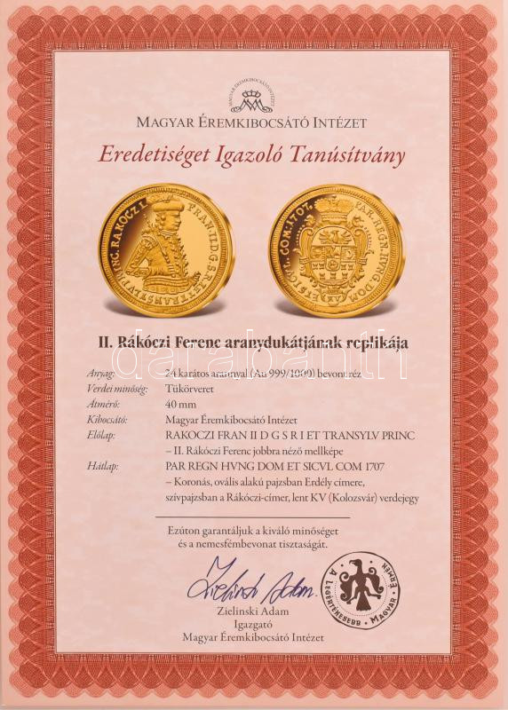 DN "A legértékesebb magyar érmék - II. Rákóczi Ferenc aranydukátjának replikája" aranyozott Cu emlékérem, "COPY" jelzéssel, tanúsítvánnyal (40mm) T:PP