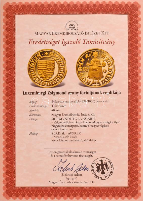 DN "A legértékesebb magyar érmék - Luxemburgi Zsigmond arany forintjának replikája" aranyozott Cu emlékérem, "COPY" jelzéssel, tanúsítvánnyal (40mm) T:PP