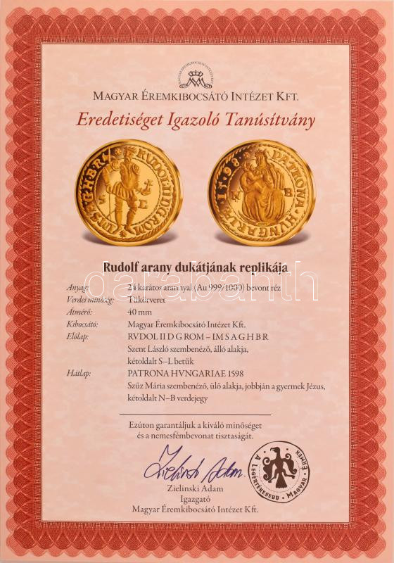 DN "A legértékesebb magyar érmék - Rudolf arany dukátjának replikája" aranyozott Cu emlékérem, "COPY" jelzéssel, tanúsítvánnyal (40mm) T:PP