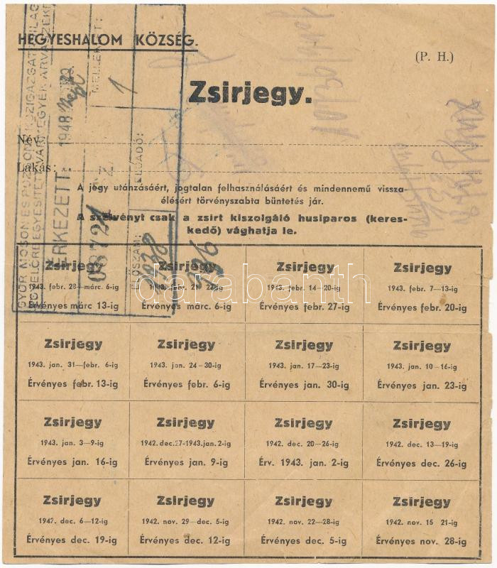Beschreibung: 1943. "Hegyeshalom község zsírjegy" bélyegzéssel T:III