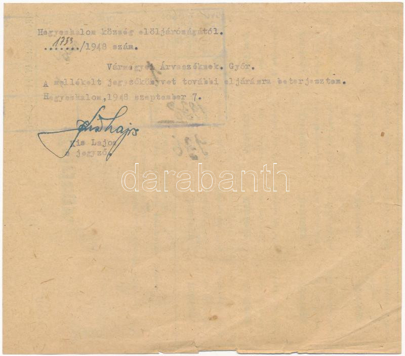 1943. "Hegyeshalom község zsírjegy" bélyegzéssel T:III https://www.darabanth.com/de/457-Fernauktion/457.0/Numismatik/Notgeld-aus-Papier-und-Metall~7/1943-Hegyeshalom-kozseg-zsirjegy-belyegzessel-TIII~II3055292