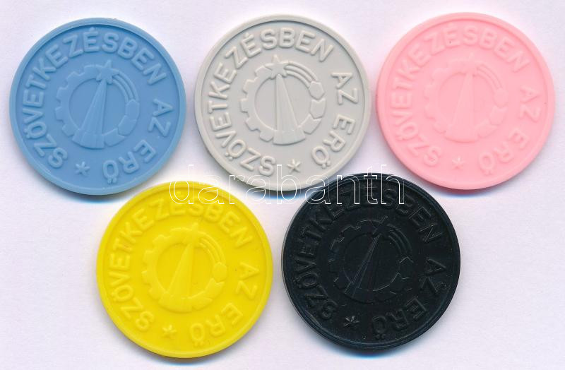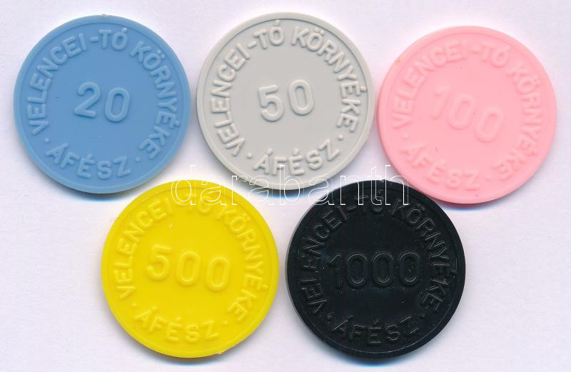 Beschreibung: ~1980. "Szövetkezésben az erő / Velencei-tó környéke - ÁFÉSZ - 20 - 50 - 100 - 500 - 1000" műanyag bárcák (5xklf) T:AU