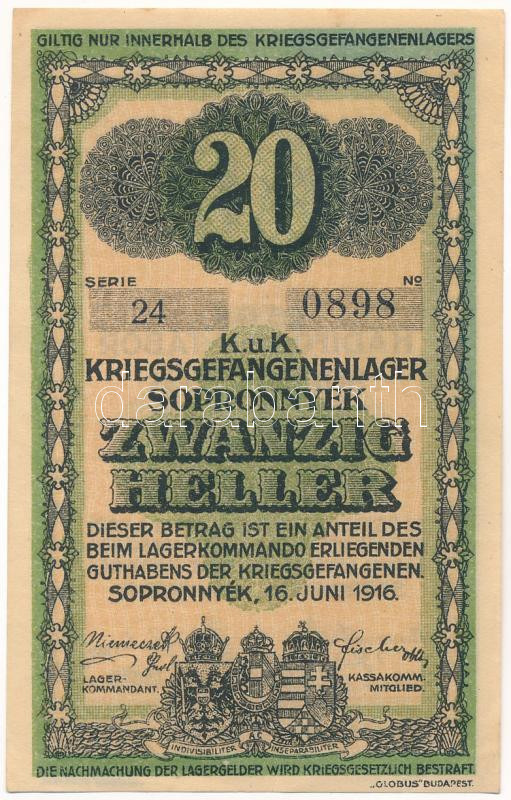 Beschreibung: Sopronnyék / hadifogolytábor 1916. 20f arab sorozat- és sorszámmal "24 0898" T:AU